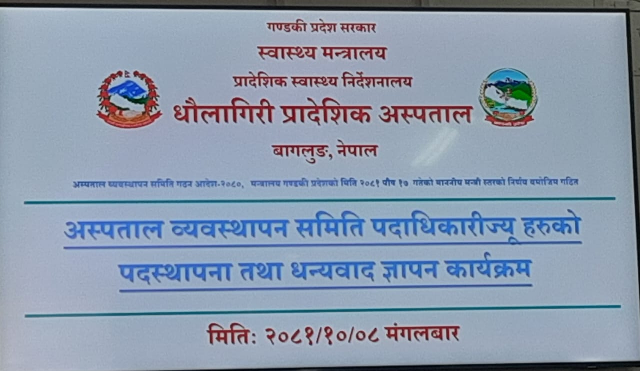 यसरी दुर्गम र पिछडिएका समुदायहरुको बाहुल्यता रहेको साविकको अञ्चलको एकमात्र विशेषज्ञ सेवा सहितको यस अस्पतालमा हाल भवन निर्माणको क्रममा रहेको साथै विशेषज्ञ र अन्य सरकारी दरवन्दीहरु रिक्त रहेको अवस्थामा उपयुक्त मेडिकल उपकरणको उपलब्धता साथै दरबन्दी अनुसारको जनशक्ति पुरा हुनुपर्ने देखिन्छ । जसबाट स्थानियस्तरमा नै गरिब विपन्न एंव स्वास्थ्यको पहुँच पुग्न नसकेका जनताहरुले स्वास्थ्य उपचारको मौलिक हक प्राप्त गर्न सक्नेछन् र नेपाल सरकार बाट ल्याइएको स्वास्थ्य नीति लागू गर्न थप सहयोग पुग्नेछ । उपयुक्त परामर्श दिने कार्यमा सामाजिक विकास तथा स्वास्थ्य मन्त्रालय गण्डकी प्रदेश पोखरा स्वास्थ्य निर्देशनालाय गण्डकी प्रदेश पोखरावाट महत्वपूर्ण सहयोग र सहजीकरण प्राप्त भएको छ । साथै आगामी दिनहरूमा अझ महत्वपूर्ण मार्गदर्शन, सल्लाह, सुझाव र सहयोग प्राप्त भै अस्पतालको व्यापक विस्तार गर्ने अपेक्षा गरिएको छ ।