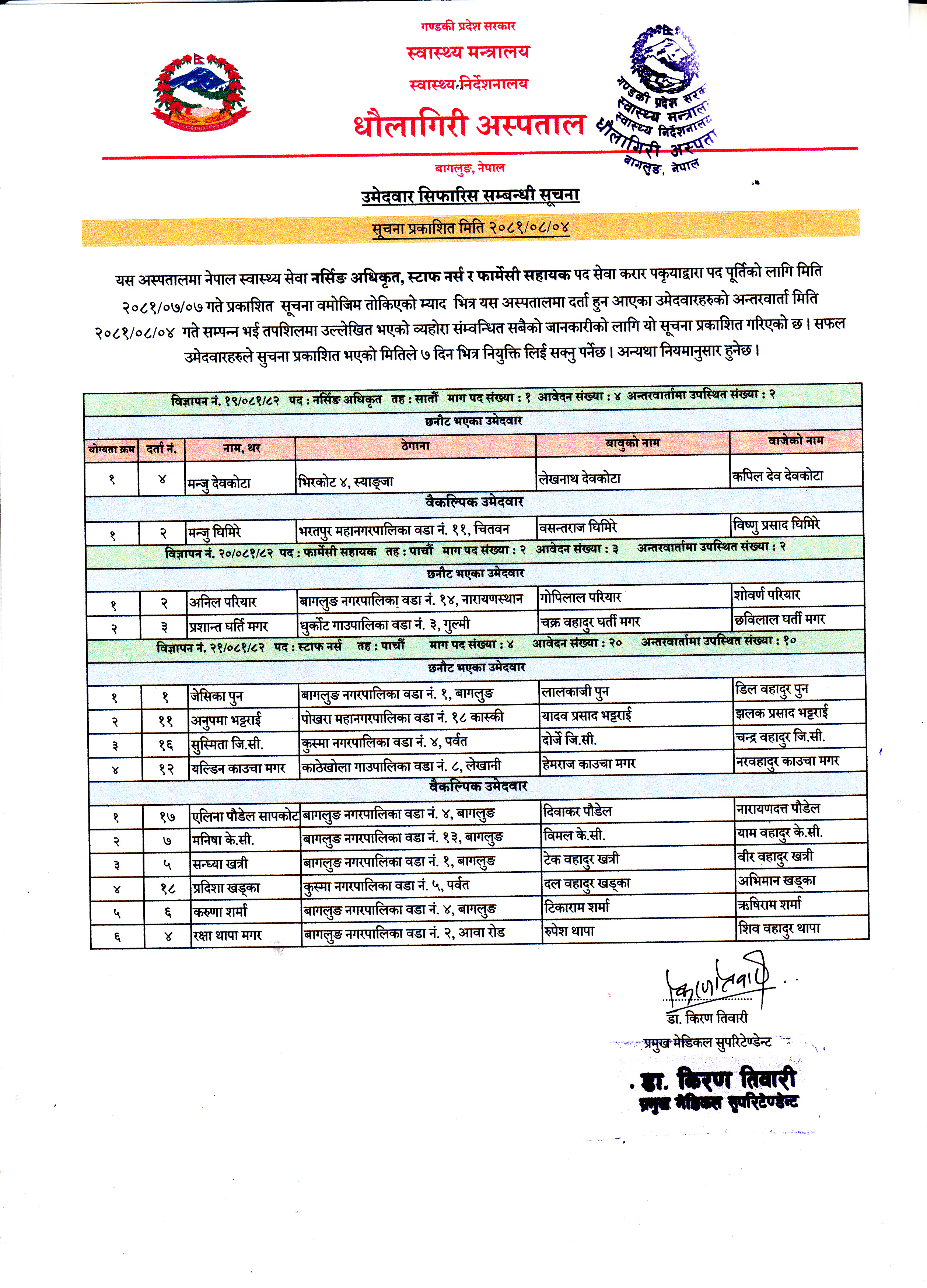 नर्सिङ अधिकृत, स्टाफ नर्स र फार्मेसी सहायक पदमा भएको अन्तरवार्ताको नतिजा प्रकाशन गरिएको