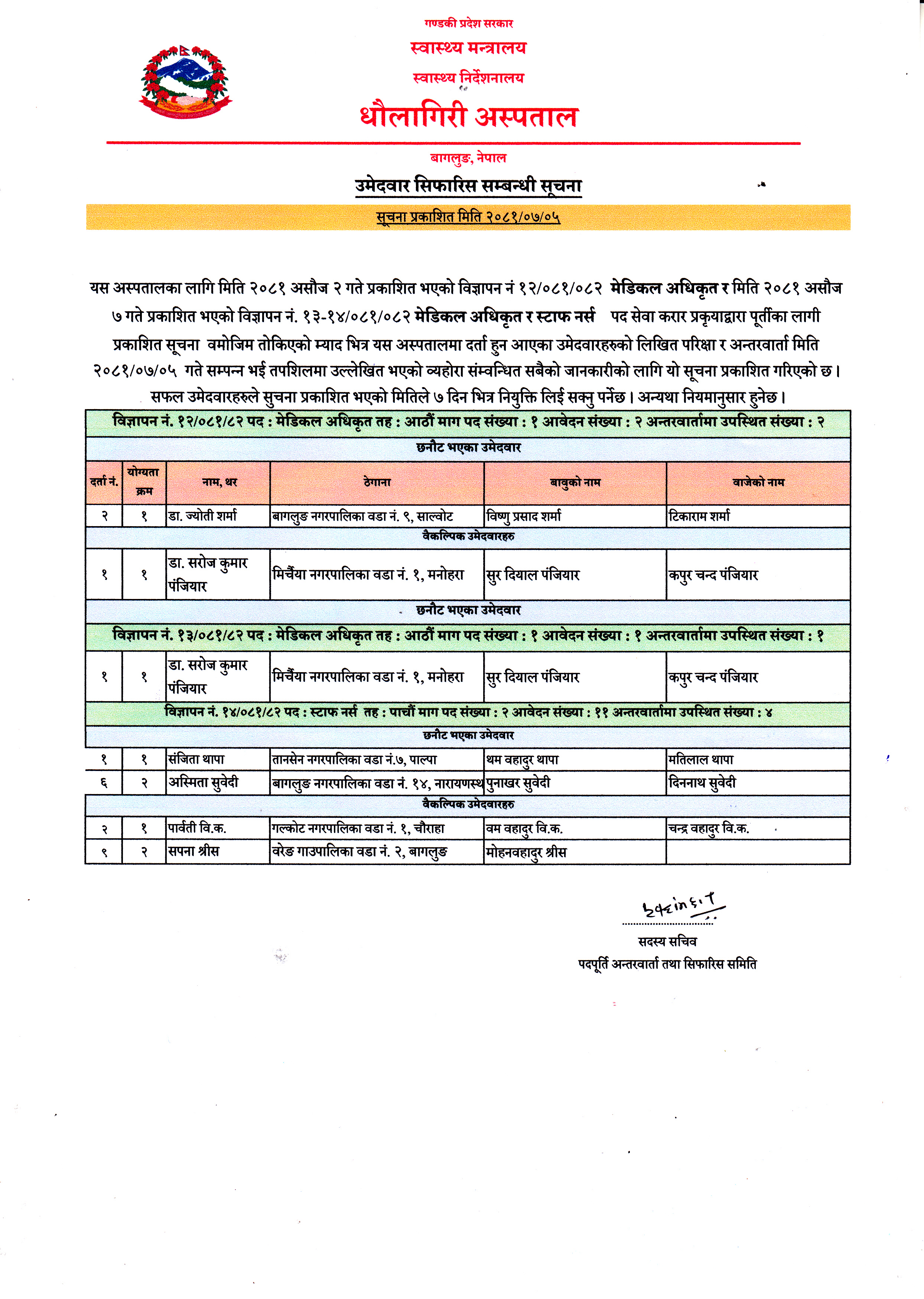 मेडिकल अधिकृत र स्टाफ नर्स पदको नतिजा सार्वजनिक गरिएको